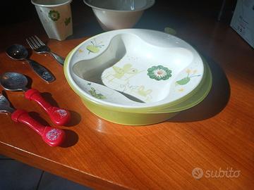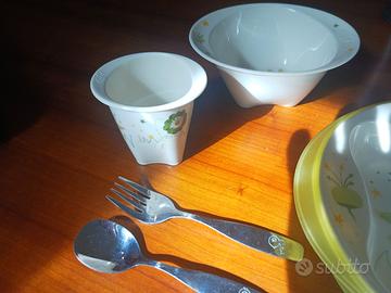 - Cofanetto pasto per bambini, 18 mesi, marca Bebè Confort, composta da piatto termico, piattino fondo, bicchiere e doppio set posate, costo 3 euro.