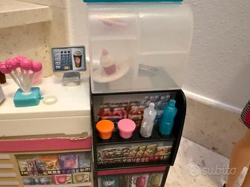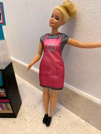 Caffetteria di Barbie, playset con accessori e bambola barista curvy. Set da gioco per bambine dai 5 anni in su che include Barbie che indossa una graziosa camicia a righe bianche e nere un grembiule rosa e sfoggia un'acconciatura raccolta dallo stile sportivo. La caffetteria dispone di una lavagna con il menu e di una macchina per preparare caffè, frullati e tè (gira la manopola sulla macchina per scegliere i gusti della tua bevanda preferita). Gli accessori aggiuntivi includono una caraffa di latte, sciroppo al cioccolato, tazze da caffè, tazze per frullato, una tazza da tè e molto altro. C'è anche una sezione con dolcetti quali lecca lecca, un cupcake e biscotti, una sezione frigo con 2 bottiglie d'acqua e una sezione snack e barrette energetiche.