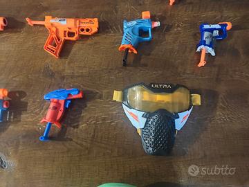 VENDO COLLEZIONE PISTOLE NERF + MASCHERA + ACCESSORI, il set comprende 9 pistole ORIGINALI NERF HASBRO, 1 maschera da battaglia con cinghia regolabile, 1 silenziatore, 1 mirino, 1 impugnatura, 1 mini pistola acqua, 1 dardo mortaio + 1 calza NERF con 20/30 dardi. TUTTO ORIGINALE HASBRO NERF. Tutto in ottimo stato e perfettamente funzionante, vendo a € 55,00.