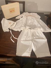 Completino bebè ricamato puro cotone: vestina, calzoncini, cuffietta. Nuovo. Ottimo x battesimo. Nella sua scatola con la sua carta velina marcata
