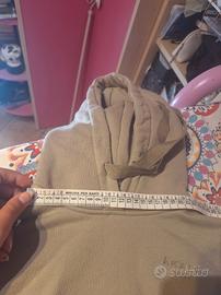 La felpa è lunga fino alla vita e può essere regolata da elastici abbinati sui lati. Il cappuccio ha un nastro in gros-grain di raso abbinato.
