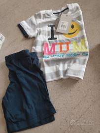 Completino bimbo, maglietta a maniche corte a righe bianche e grigie con stampa davanti, pantaloncini blu scuro in maglia con elastico.