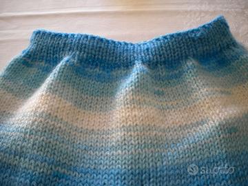 Tutto di lana, fatto a mano ai ferri. Lana con sfumature di azzurro miscelata col bianco.