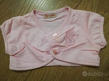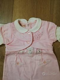 Completo pagliaccetto + bolerino rosa, pari al nuovo, composto da tutina intera a manica lunga e bolerino che può essere usato anche separatamente. In puro cotone molto morbido, ottima qualità e rifiniture marca BRUMS. Taglia 3 mesi.