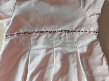 Strepitoso completo per bambina composto da un vestito bianco e rosa con swarovski e un cardigan rosa. - Cardigan in maglia Angora rosa con bordi decorati da swarovski . - Vestito bianco e rosa con pieghe sulla gonna. Swarovski - Dettaglio fiocco in vita sul vestito. - Logo ricamato sul cardigan e sul vestito. Bluemarine