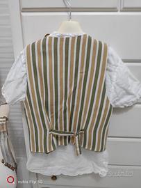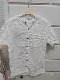 completo Bambino, pantalone con elastico, camicia con taschino di lino, e gilè con laccetto dietro, ideale per comunione , e eventi importanti. tutto di lino, nuovo indossato solo una volta, età 9/10 anni ,portato in lavanderia solo leggermente scolorito sulle ginocchia.
