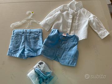 Bellissimo completo bimbo 9 mesi altezza 74cm marca Boboli, ideale per Battesimo, Compleanno, occasioni speciali estive. Comprende: camicia bianca, gilet celeste, pantaloncini celesti, bretelle, papillon celeste, scarpine a quadrettini in pelle e tessuto n.17 e calzini traforati