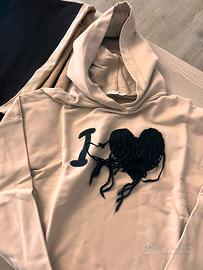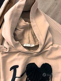Composto da pantaloni a palazzo neri con banda laterale beige come la felpa corta beige con applicazione centrale cuore ricamato e cappuccio