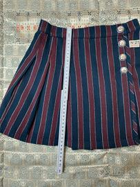 Gonna a portafoglio(8anni)modello a pieghe con righe verticali, chiusura laterale con bottoni decorativi.