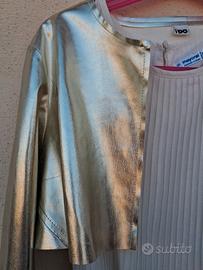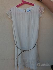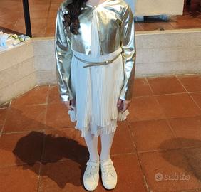 Vendo incantevole set da cerimonia per bambina, perfetto per occasioni speciali, matrimoni, prime comunioni o cresime. Il completo è composto da due pezzi di alta qualità e scarpe Okaidi: Il set include: Vestito Mayoral (Taglia 10 - 140cm): Abito smanicato in raffinato chiffon plissé color panna. Taglio fluido, molto leggero, con cintura sottile argentata inclusa. Chiusura posteriore con bottoncino. Unica pecca cinturino in condizioni non impeccabili. Bolerino iDO: Coprispalle corto a maniche lunghe in tessuto lamé argentato. Perfetto per illuminare l'abito e proteggere dal fresco senza nascondere il design del vestito. Scarpe Okaïdi: scarpe in tela eleganti coordinate n. 34 in tinta con il completo. Comode e di ottima fattura