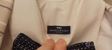 Completo elegante da ragazzino: - giacca sfoderata leggera sarabanda tg. XL 164 cm (ma per me veste meno) - camicia tg.42 Manuell & Frank Italy - pantalone blu tg 42 con comoda vita regolabile di Manuell & Frank Italy - papillon in pura seta Indossato solo per 1 cerimonia