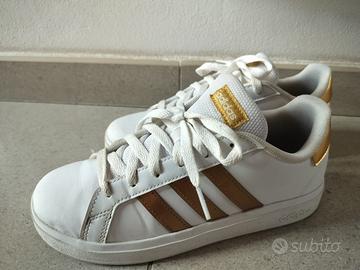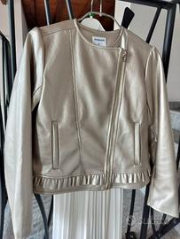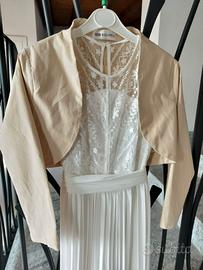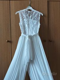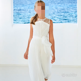 Tuta plissettata smanicata marca Mayoral tg. 11-12 anni 152 cm, girocollo con chiusura con bottone sul retro + giacca in similpelle + bolerino marca Bolerose in tinta + sneakers Adidas bianco/oro. Indossato 1 volta.