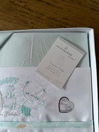 Completo culla 120x90 composto da 3pezzi: lenzuolo inferiore, lenzuolo superiore e federa. Bianco e verde Tiffany. Mai usato.