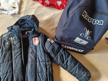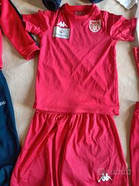 Vendo in unico lotto completo da calcio taglia 10 anni - ma adatto a bambini di 8 anni (140 cm) composto da: tuta con manica lunga e pantaloni lunghi, completo (maglietta e pantalonilcini) da allenamento corto, altre 2 magliette (datate) e 2 pantaloncini di ricambio, 1 paio di calzettoni, 1 maglietta bianca di rappresentanza, giubbotto invernale e con maniche staccabili, zaino.