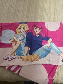 Completo letto 100% cotone. Usato pochissime volte, come nuovo. Bellissimo, con federa con doppia stampa, grande Barbie sul lenzuolo, lenzuolo di sotto a righe. Acquistato da Lidl. Disponibile anche trapunta coordinata venduta separatamente.