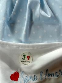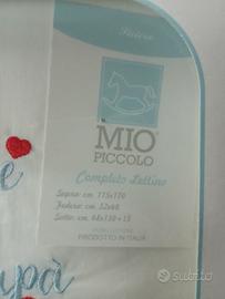 Bellissimo set Nascita in 100% cotone, adatto al contatto con la delicata pelle del neonato, il completo di lenzuola con scritta ricamata e bordo celeste a contrasto sul bianco una vera chicca !