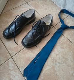 Vendo elegante set completo da ragazzo per cerimonie firmato dal brand italiano Nazareno Gabrielli. Il completo è stato indossato una sola volta per una comunione ed è in condizioni impeccabili. Giacca: di rosso intenso e raffinato, caratterizzata da un'eccellente fattura sartoriale; presenta bottoni logati, profili scuri a contrasto con le tasche e lo stemma del brand ricamato sul taschino (Taglia 44 / 14 anni). Pantalone: blu scuro, taglio classico con piega stirata; estremamente confortevole grazie alla fascia elastica in vita che si adatta perfettamente alla corporatura (Taglia 44 / 14 anni). Scarpe: sono marcate Mister Jerry, sono stringate in vera pelle italiana colore blu modica, sono eleganti e resistenti e il numero è 38. Inoltre è inclusa anche la cravatta.