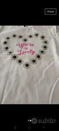 T-shirt bianca svasata con scritta e fiori, leggings vichy bianco/nero.