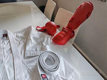abbigliamento per karatè per bambini età circa 7/8 anni. altezza 130 cm. composto da giacca, pantalone, cintura, parastinchi e guanti. il tutto usato solo 2 volte. praticamente nuovo