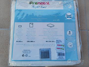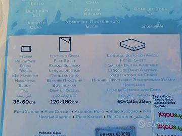 Completo per lettino Prenatal nuovo. Puro cotone. Fodera 35x60cm, lenzuolo sopra 120x180cm, lenzuolo sotto con angoli 60x135x20cm