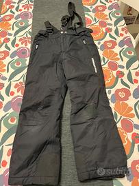 Vendo completo sci bambino così composto. Giacca blu, marca wedze, misura 125/132 cm, con tasche esterne, ghetta interna, porta skipass, polsini regolabili, cappuccio. Pantalone nero, marca rock experience, misura 128 cm, con tasche laterali, bretelle, ghette e chiusura con bottone clip. Il pantalone ha una piccola toppa impermeabile sul ginocchio
