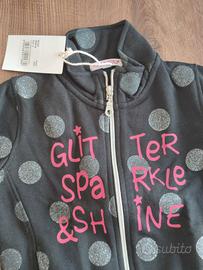 Completo bambina composto da felpa con zip e pantaloni coordinati Colore: nero con pois argentati glitter Stampa frontale rosa “Glitter Sparkle & Shine” Felpa con zip centrale e colletto alto Pantaloni con elastico in vita, comodi e pratici Tessuto morbido e leggermente elasticizzato Ideale per tempo libero, scuola o sport Condizioni: nuovo con etichetta Taglia: 4 anni