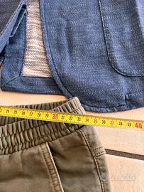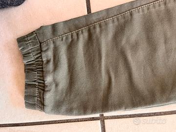 Completo pantalone morbido verde milutare,elastico in vitacecdul fondo,ccirdibato a giacchina feloa primaverike,bottoni su davanti,toppe a contrasto.Nuovo,Era’12/14 anni,marca Benetton