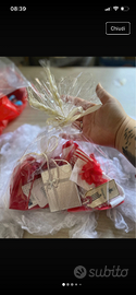 La confezione regalo comprende: - camicia porta fortuna ( prezzo listino 16,90) - due bavaglini con due diversi disegni ( prezzo listino 9,90) - fasciata nascita con fiorellini (prezzo listino 14,90) - non può mancare la collana a cuori per la neo manna bigiotteria anallergica ( prezzo di listino 15 ) Totale di listino 57 euro vendo a metà