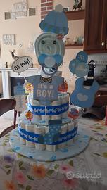 Realizzo su pretotazione torte di pannolini per nascita, baby shower e battesimo...a forma altalena, trenino o di torta a uno due o tre piani. Il prezzo varia a seconda dei piani, accessori e pannolini... si valuta assieme... a partire dai 30 euro in su.