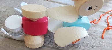 Coniglietti in legno da trainare primi passi Janod, gioco multisensoriale per lo sviluppo della motricità. Pittura ad acqua. Mis. 18 x 8 x 10,5 cm. Usato pochissimo, solo l'impercettibile ombreggiatura sotto gli inserti in pelle ecologica non lo rende pari al nuovo. In confezione originale. € 10.