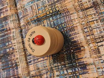 Simpatico contenitore in legno per dentini da latte, adornato da una piccola coccinella e dalla scritta "denti da latte". Chiusura ad avvitamento. Nuovo. euro 5