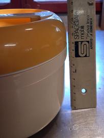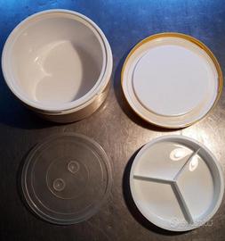 Contenitore termico dimensioni circa 14x13 cm, con piatto a tre scomparti e coperchietto a parte, chiusura ermetica.