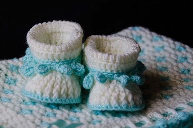 Coordinato neonato, formato da copertina double face, interamente confezionata a mano con lana acrilica e lana acrilica lamè e nastro in raso. La copertina misura cm 73 x cm80 compresi i pon pon. Le babbucce confezionate con lo stesso materiale hanno una base di cm10 e un altezza di cm 6.