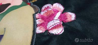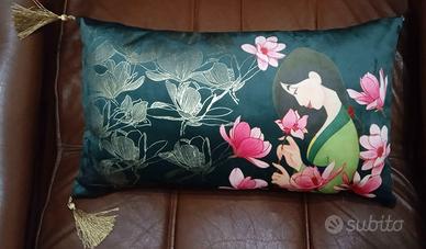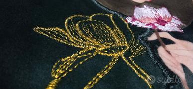 Coperta e cuscino in velluto con parti ricamate e stampe dorate.