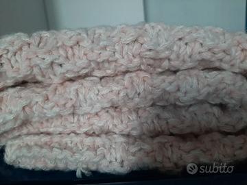 Vendo copertina rosa melange. Creata artigianalmente a maglia da mia madre. Usata, ma in buone condizioni. Di lana, con imperfezioni da lavorazione a mano, ma nessun danneggiamento. Misura 106 x 98 centimetri.