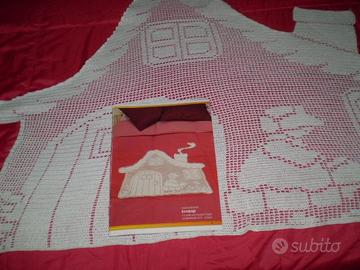 Grande coperta con casetta di campagna e bimba in costume dell'800 che cura il giardino con tanti particolari come i fiori, la farfalle, il comignolo col fumo. Fatta a mano all'uncinetto con filo colore bianco mai usata, nuova adatta al lettino di una bimba per il Battesimo o il 1° compleanno o la nascita o per chi amava Hollie Hobby, personaggio degli anni 70-80 perché incorniciandola ne può fare un bel quadro. Mis. cm 144*90+20(il fumo). Prezzo non trattabile. Disponibili altri lavori all'uncinetto a tema marino, religioso, per gli anniversari, con gatti, segnalibro, cesti per bomboniere (2 per Battesimo: 1 per bimba, l'altro per bimbo, 1 per matrimonio stile marinaro, 1 per allestimenti autunnali)