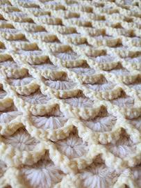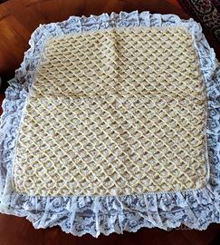 Stupenda copertina da culla o carrozzina antica fatta a mano, in lana lavorata con balza in prezioso pizzo tutto intorno. Misure 60 x 56 cm più 10 cm di pizzo quindi 70 x 66 cm totali. Colore bianco e giallo chiaro. Stupenda anche per un regalo.