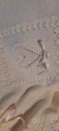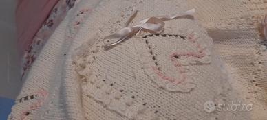 Copertina bambina 70×80 a ferri e uncinett e ricamo ,colore pànna con tiçamo rosellßine roaa,La copertina è lavorata a mano con una perfezione davvero çhe stupisce adatta ad un a