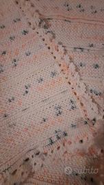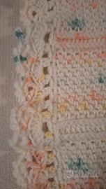 copertina fatta a mano uncinetto mis. 64 x 84 cm ca. Lana acrilico color panna di base e verde, arancio/rosa , e giallo.