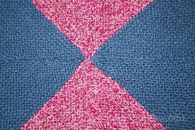E' composta da 16 quadrati (ognuno formato da 2 triangoli di colori diversi: rosa variegato, azzurro scuro, grigio verde) che insieme formano un allegro e originale motivo a scacchi multicolor.