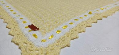 Vendo copertina di lana giallo chiaro e bianco con nastrino di raso, misura 67/71 cm, fatta a mano all'uncinetto.