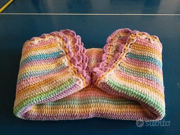 Copertina di lana realizzata a mano con uncinetto a righe multicolori. Misura 89 X 74 cm. Mai usata conservata bene.