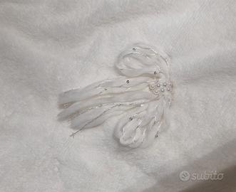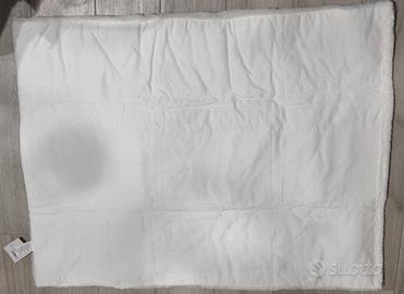 Coperta invernale per neonata, esterno in pelliccia sintetica bianca e fiocco con perline e interno in cotone felpato.