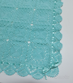 Fatta a mano all'uncinetto, questa copertina è un gioiellino! E' in puro cotone, color verde acqua. Leggera e morbida sarà l'ideale per coprire l* pup* nelle sere estive. Le dimensioni sono cm 80 x 63.