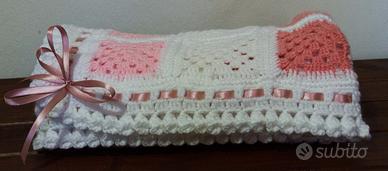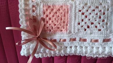 Copertina per culla o copri-spalliera per divano, realizzata interamente a mano con lana acrilica e rifinita con nastro in raso. Ha una misura di cm72 x cm 89.