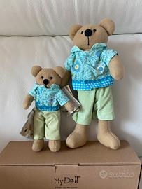 Coppia Baby Orsetti, marca My Doll, nuovi con etichetta e confezione originale, materiale in pile colore beige, abiti removibili, prodotti artigianali, lavorati a mano, prodotti fuori produzione, vintage, molto carini ed ottima qualità