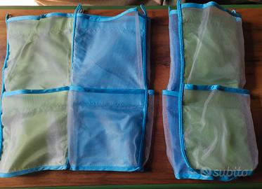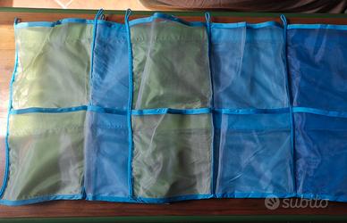 due portatutto ikea, ciascuno con 6 tasche, si appendono ovunque basta un nastro passante negli occhielli o due gancini. versatili come tutte le cose IKEA, lavabili benissimo. per cameretta, bagno o cucina. i giocattoli della prima foto non sono inclusi, li ho messi solo per farvi vedere che le tasche sono trasparenti davanti