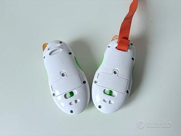 Coppia di giochi musicali Chicco composti da due telecomandi interattivi per la prima infanzia. Ogni unità ha 4 tasti colorati con forme di animali numerati, pulsante centrale per effetti sonori e sfera superiore rotante con immagini. Realizzati in plastica rigida, entrambi presentano interruttore on/off e vano batterie sul retro. Uno dei due include cinturino arancione per il trasporto. Mostrano normali segni d’uso ma risultano integri e senza rotture. Ideali per stimolare suoni, colori e numeri.