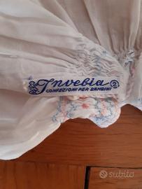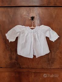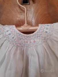 Coprifasce in cotone anni 50 con punto smock al girocollo in rosa e celeste a maniche lunghe sbuffanti. Nell’etichetta c’è scritto 2, taglia 2 mesi abbondante ( a seconda del bambino) . Misure: lunghezza da spalla a bordo inferiore cm. 25,5; larghezza da ascella ad ascella cm. 29. Le foto fanno parte integrante della descrizione