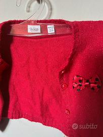 Delizioso coprispalle in maglia rossa con dettagli luccicanti e fiocchetto decorativo.